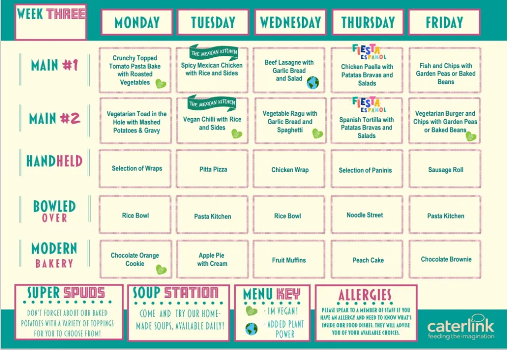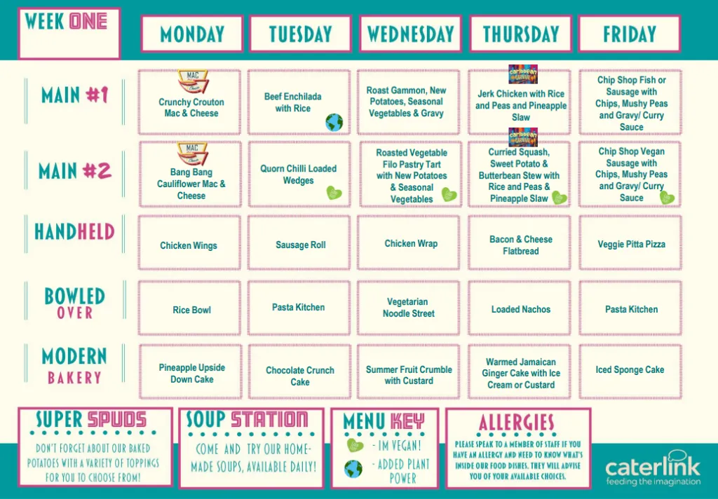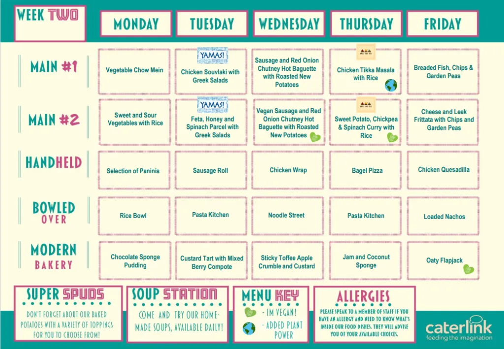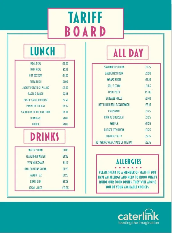 Our menus are nutritionally balanced, full of local flavours and tailored to suit your school. They not only meet, but exceed government guidelines. Whether it’s lunch for students, or open evenings, we have lots of fresh ideas. Whatever your requirements we are able to offer a service that suits you.Caterlink provide our onsite catering. Information regarding Caterlink, menus and prices can be found below.