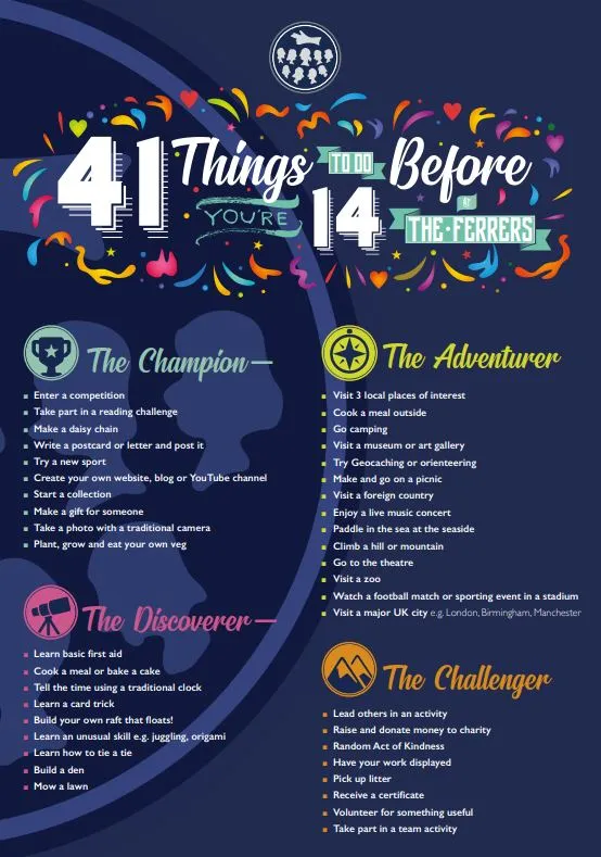 We promote a number of challenges at different stages in our students’ lives. We strive to offer the opportunity for our pupils to achieve ’41 Things before you’re 14′. At the Ferrers we are dedicated to providing our students with a chance to experience different childhood experiences through trips, clubs and other Learning Outside the Classroom activities.