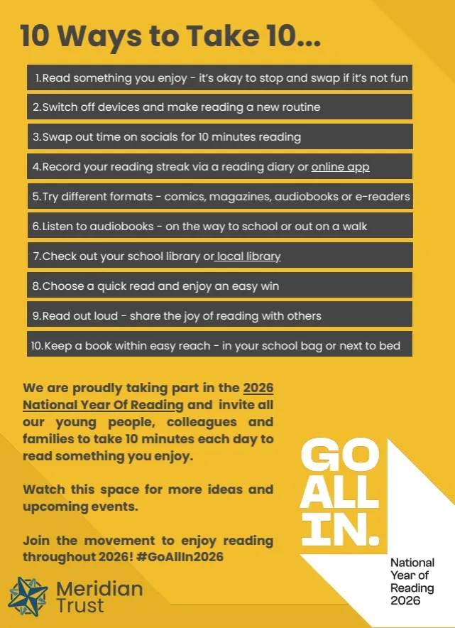 To help kick start the 2026 National Year of Reading, we’re inviting everyone in our school community and across our trust, to take 10mins each day to read something you enjoy.