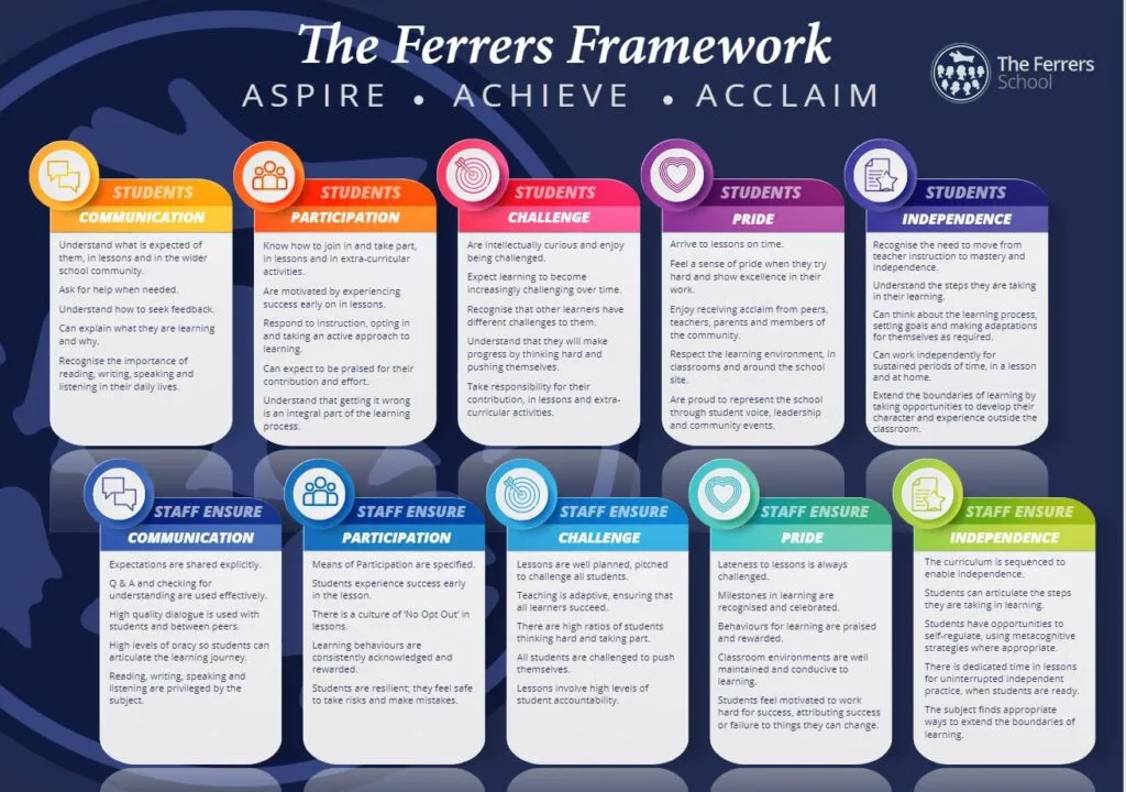 The Framework was designed by several stakeholders working collaboratively together, from staff and students to Academy Council members and Trust colleagues. It provides us all with a blueprint for excellence and we hope that, as parents and carers, you will also take an interest and choose to reinforce the expectations of The Ferrers Framework at home.